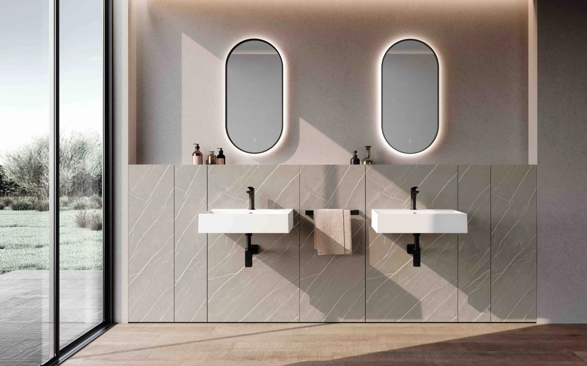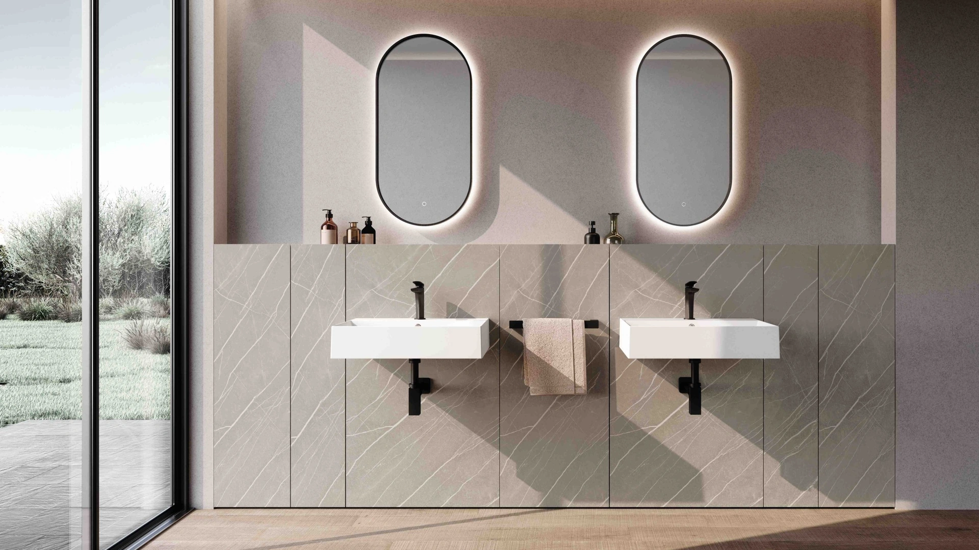 Mobile da Bagno M2 System 243 di Baxar: clicca e ottieni informazioni su mobili bagno a terra in HPL e elementi accessori del marchio.