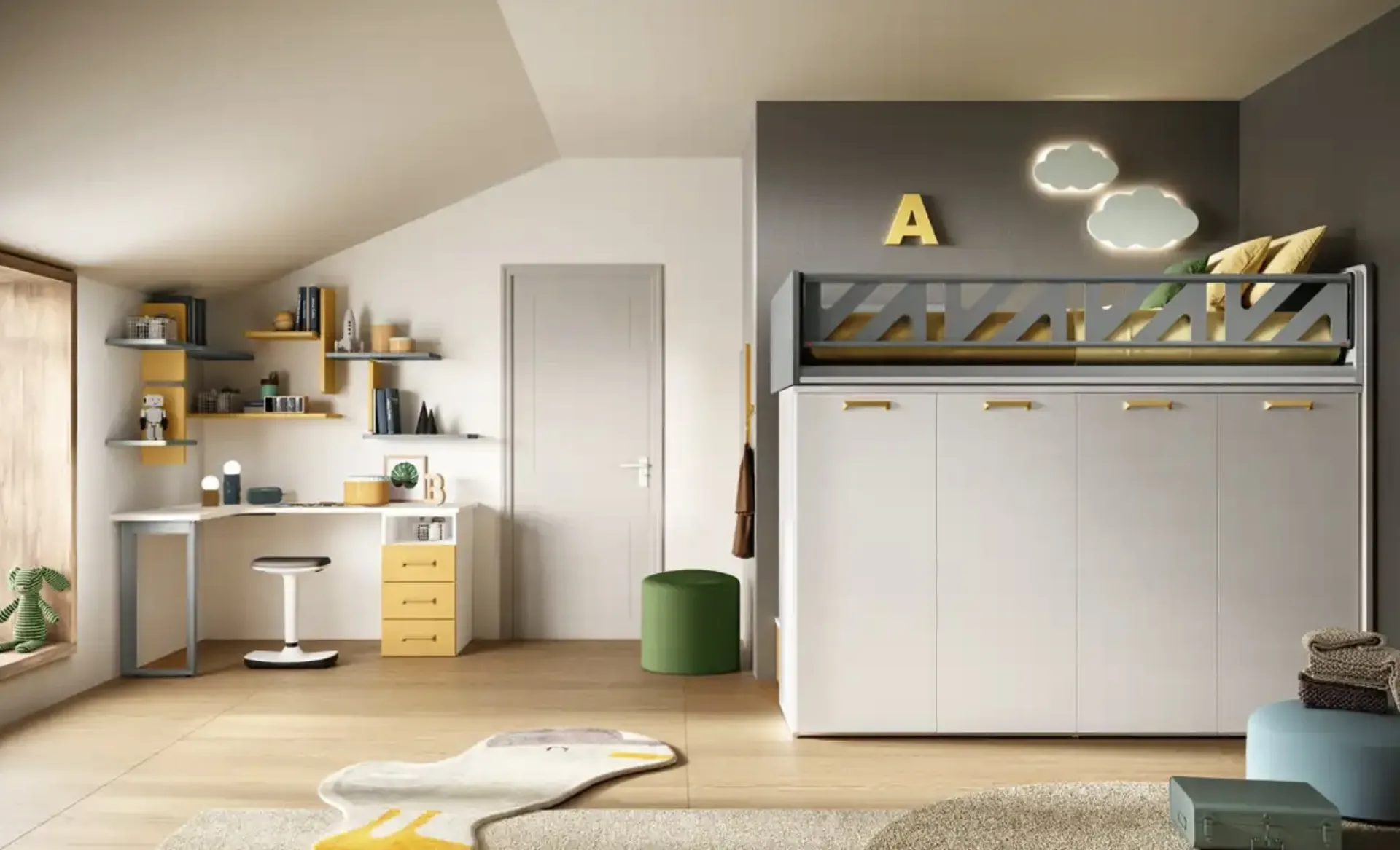 Clicca e scopri di più sulla cameretta per bambine K109! Le Camerette a soppalco Moretti Compact Camerette ti attendono.