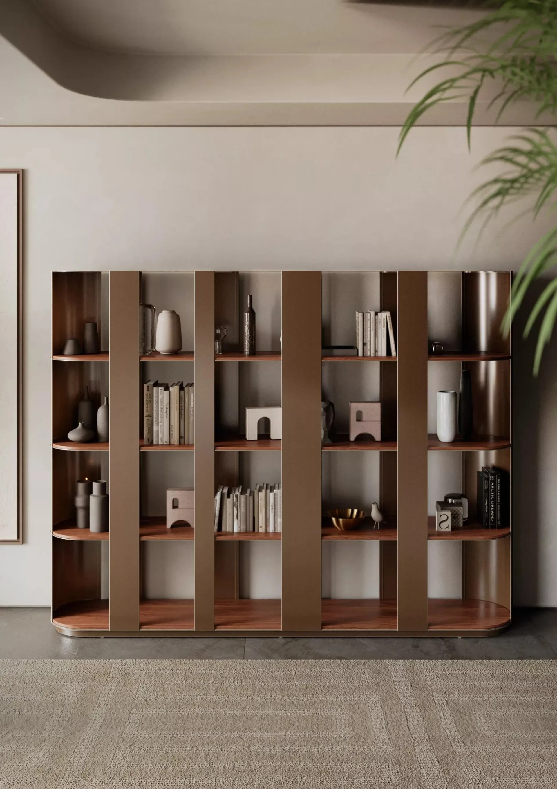 Texture di pregio e linee decise: scopri la libreria Helena di Bontempi tra le più esclusive Librerie design divisorie.