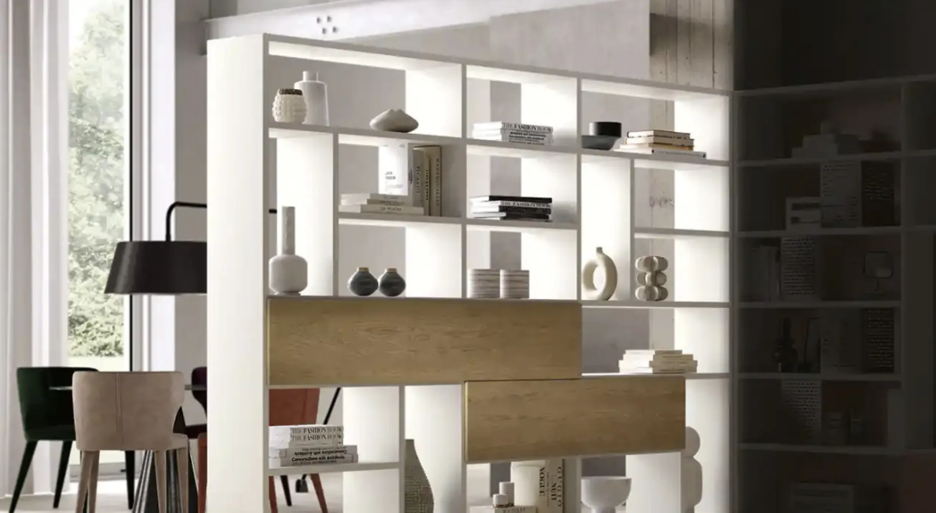 Se vuoi librerie divisorie per la zona giorno, clicca e scopri le nostre soluzioni moderne: il modello Kosmos KL211B Moretti Compact Giorno Notte ti sta aspettando!