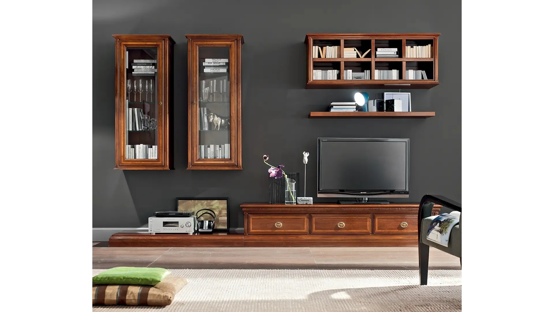 Vuoi arredare un soggiorno pratico e dinamico? Ti offriamo la parete attrezzata I Ciliegi composizione 02 Le Fablier dalle linee decise classiche.