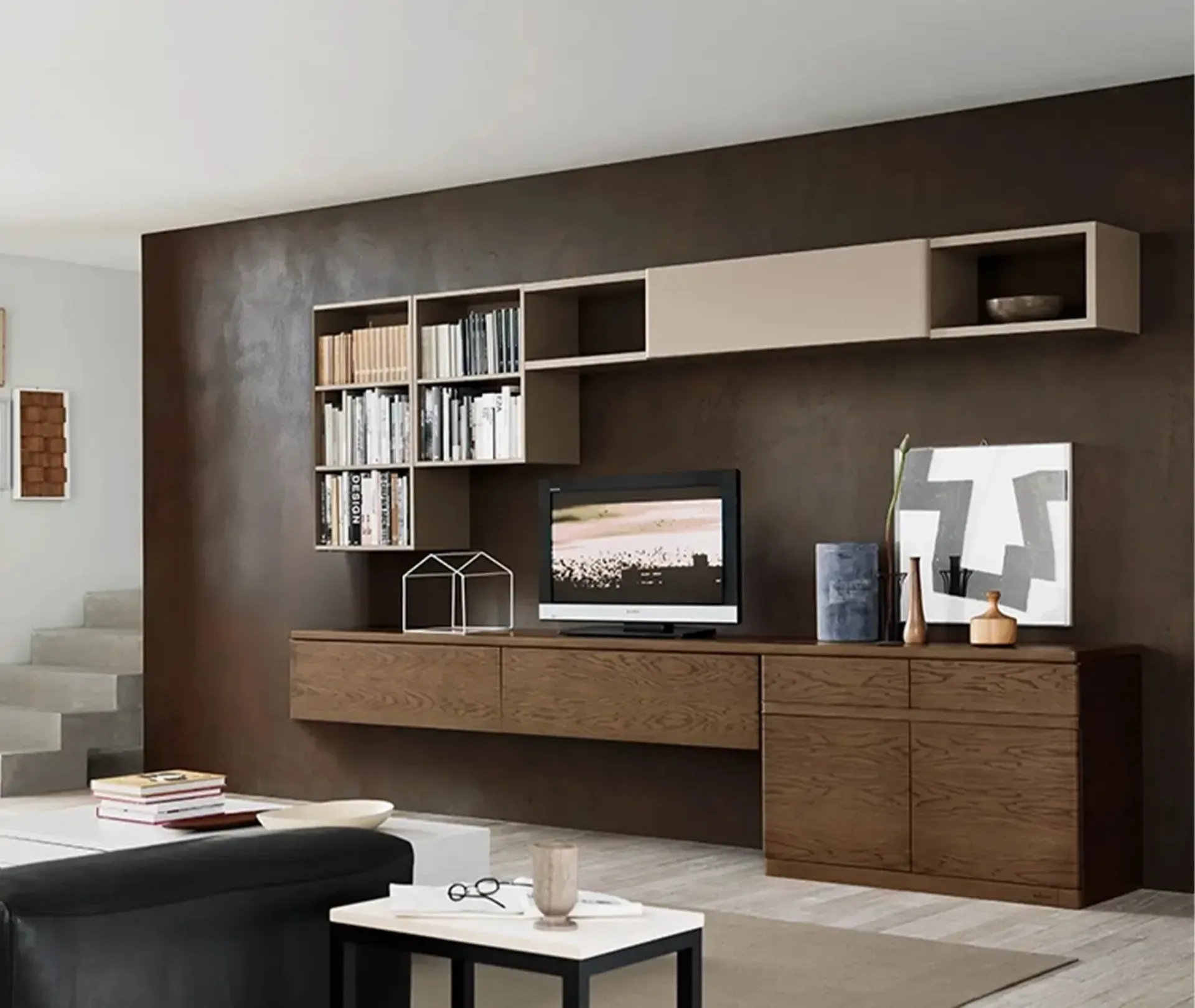 Parete attrezzata con basi a terra e basi sospese in rovere