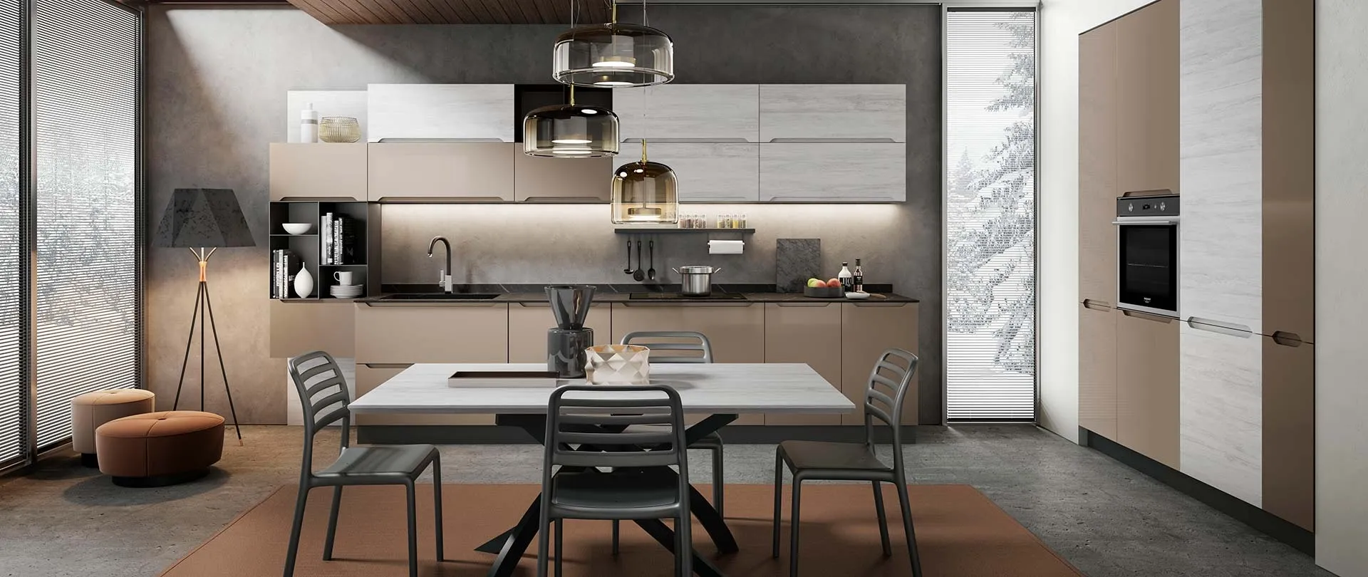 Scopri componibilità personalizzabile delle Cucine ad angolo Evo Cucine: la cucina Carima Tortora e Rovere in polimerico ti aspetta!