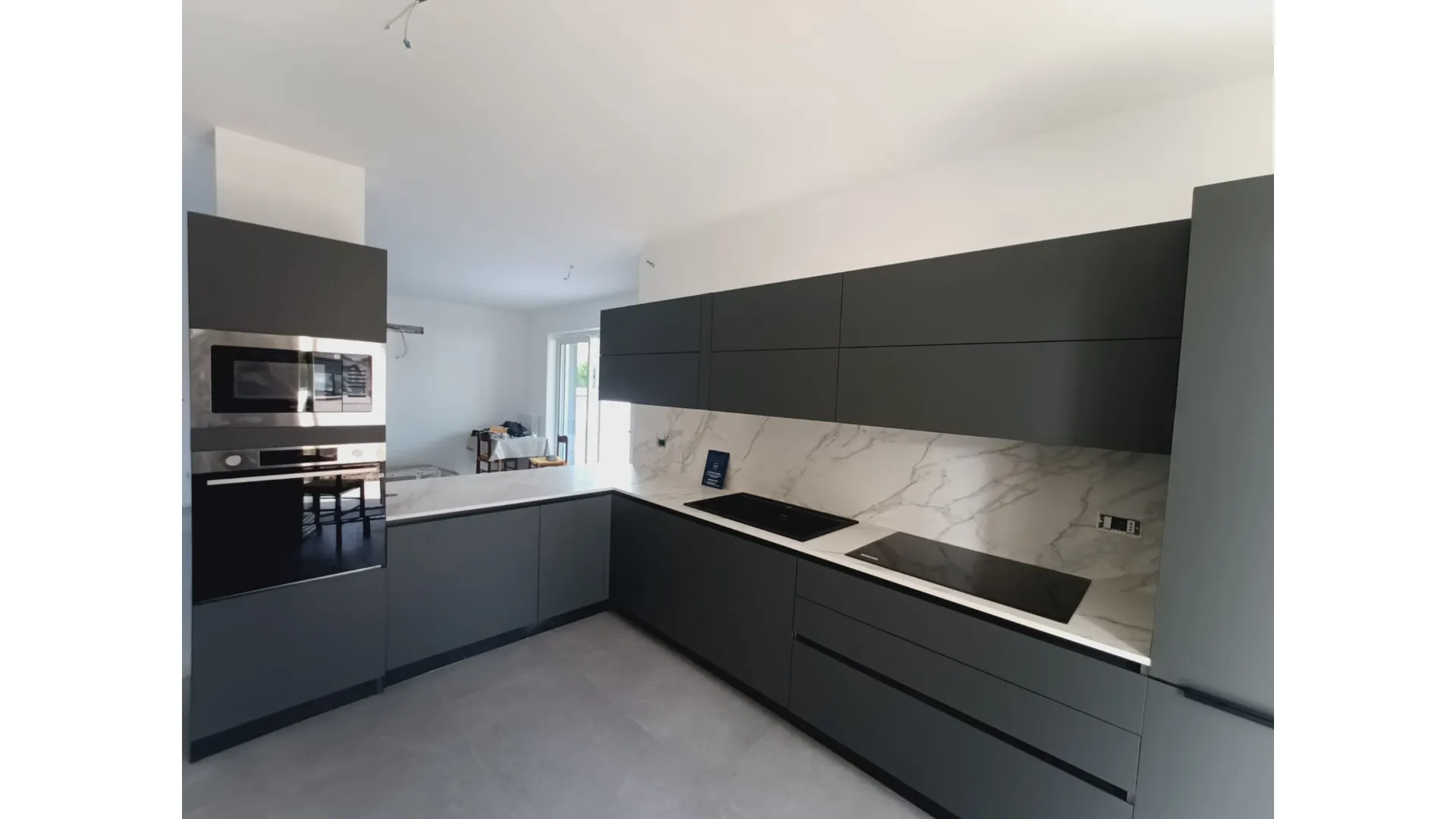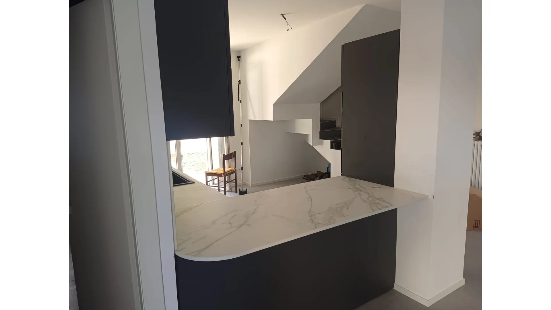 Realizzazione cucina moderna Mod. Infinity con ante in pet opaco, top neolith Abu Dhabi e penisola incastonata tra muro e pilastro